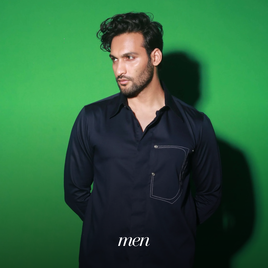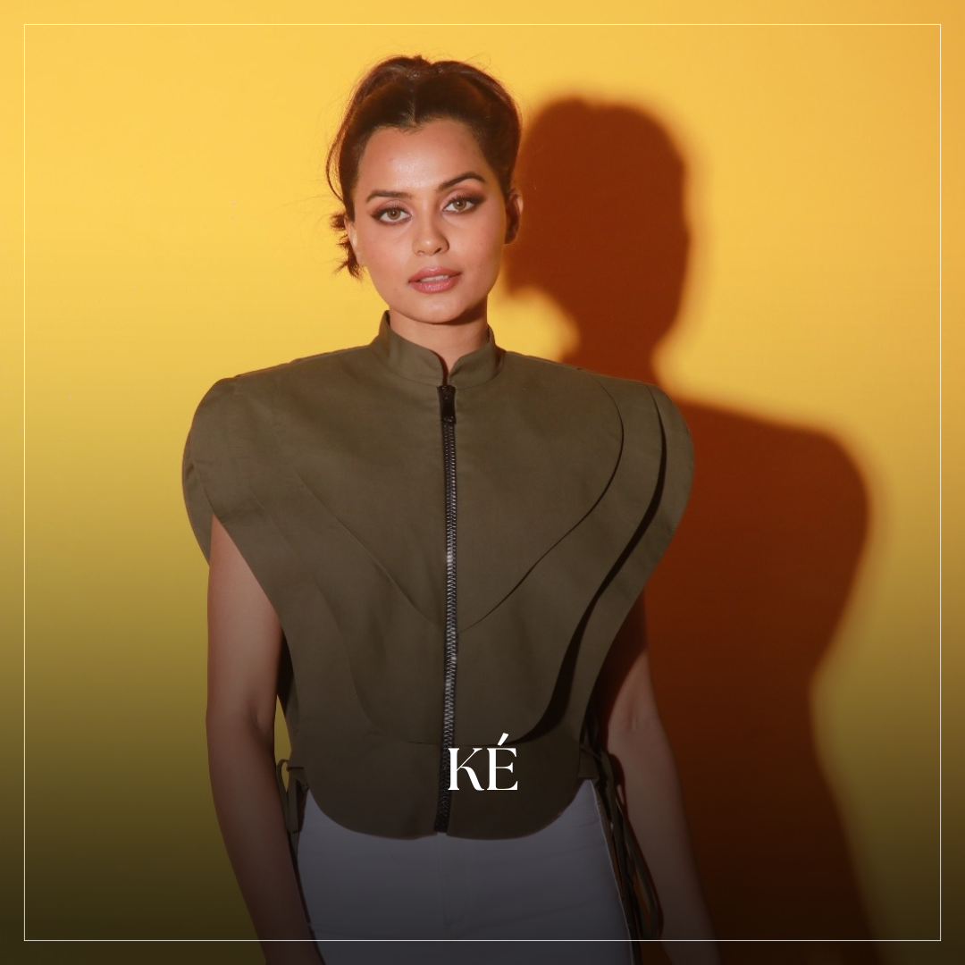 Beige linen co-ord set features with pearl & diamond work with matching straight pants.
