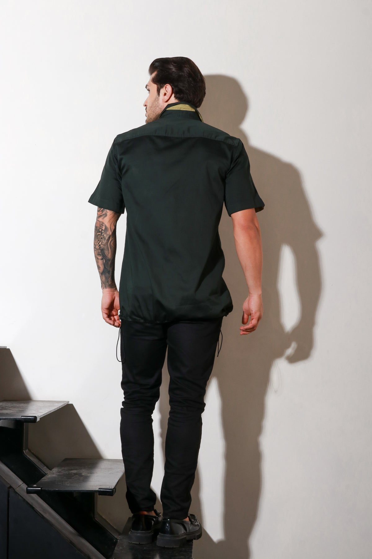 Dark green half sleeve shirt with contrast detailing and elasticated bottom feature.