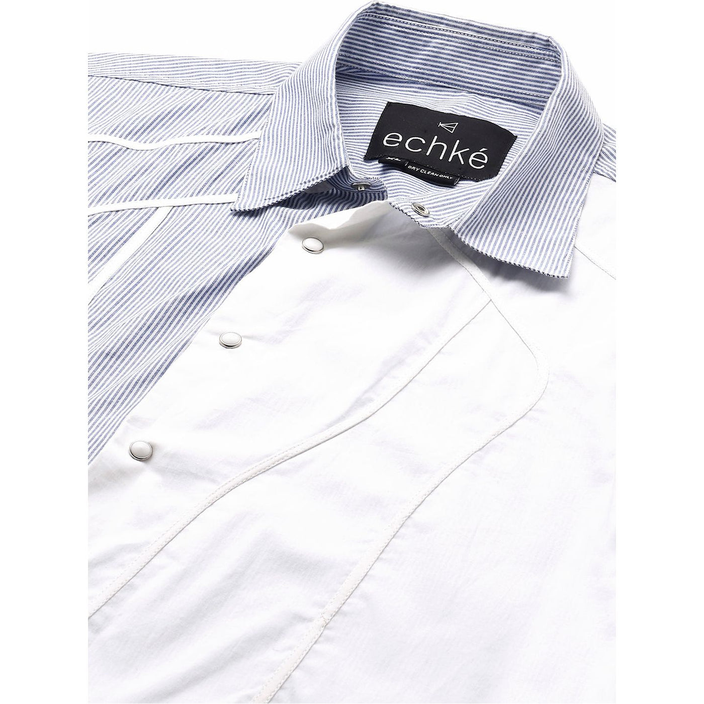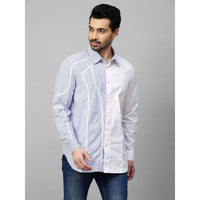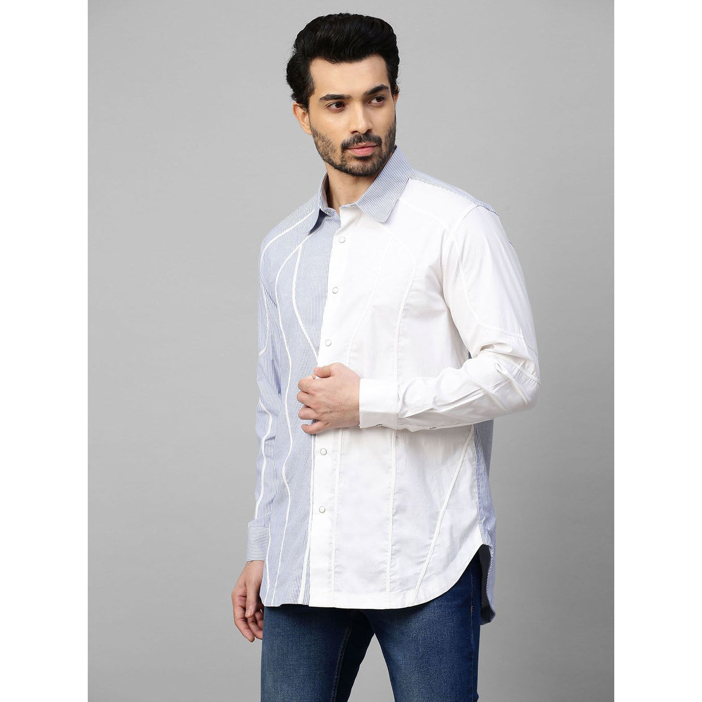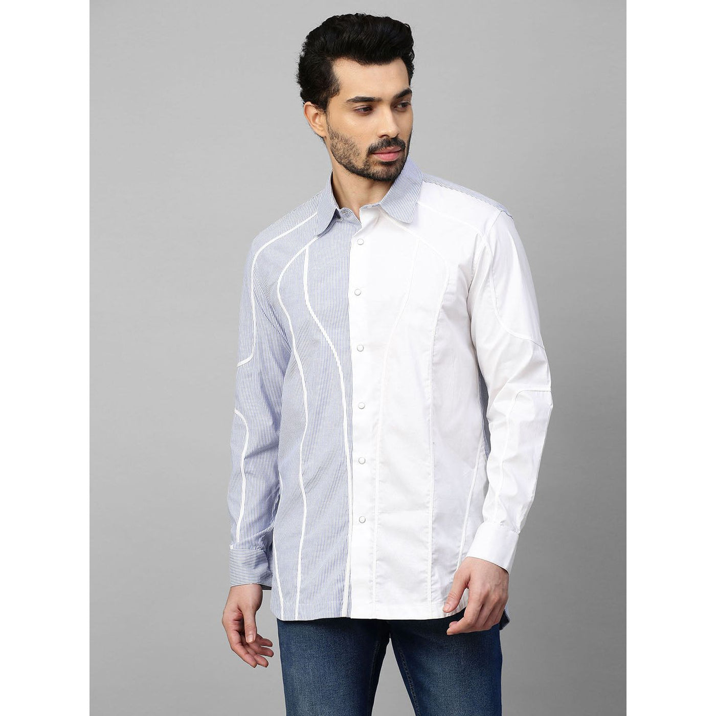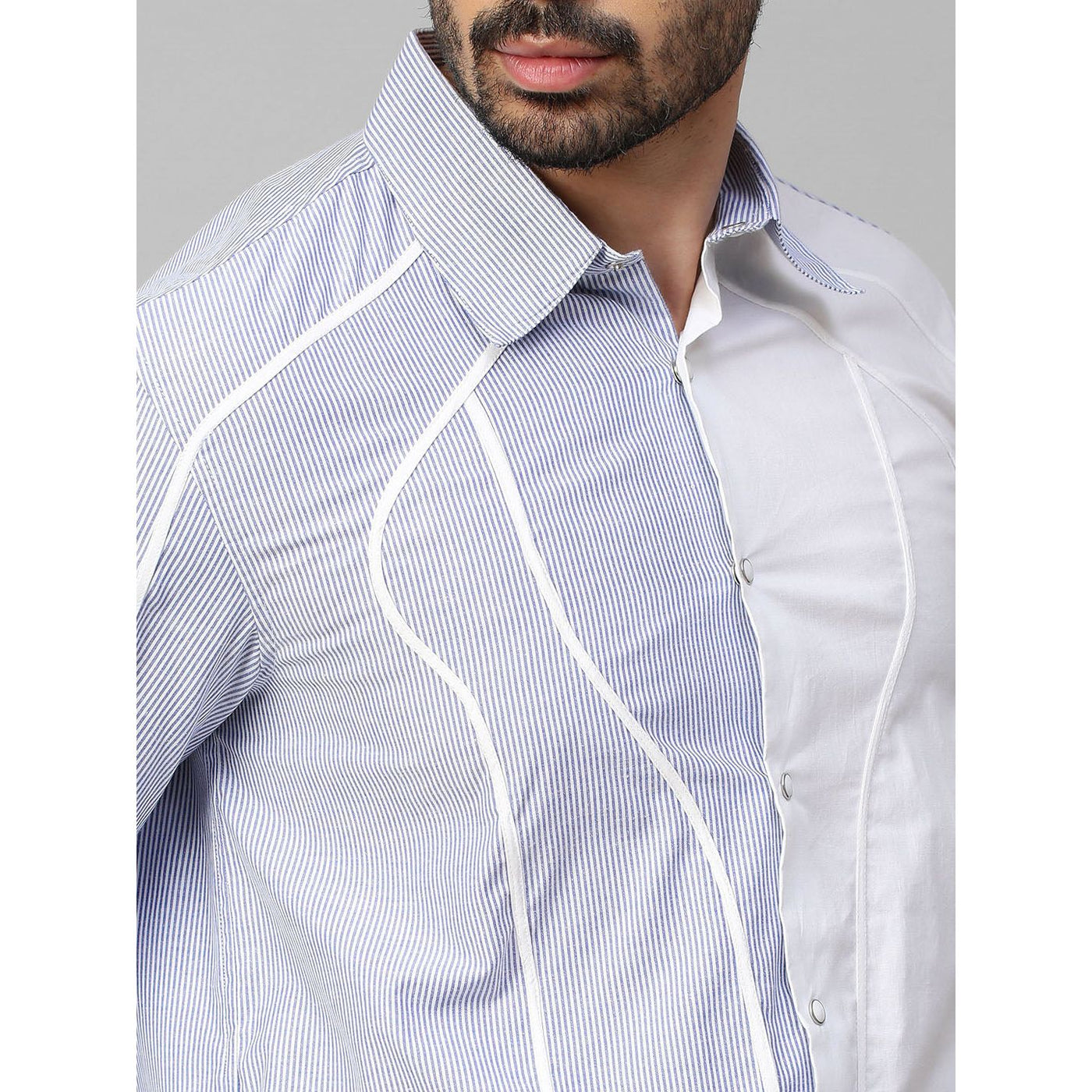 White and blue stripe shirt with contrast wave piping details.