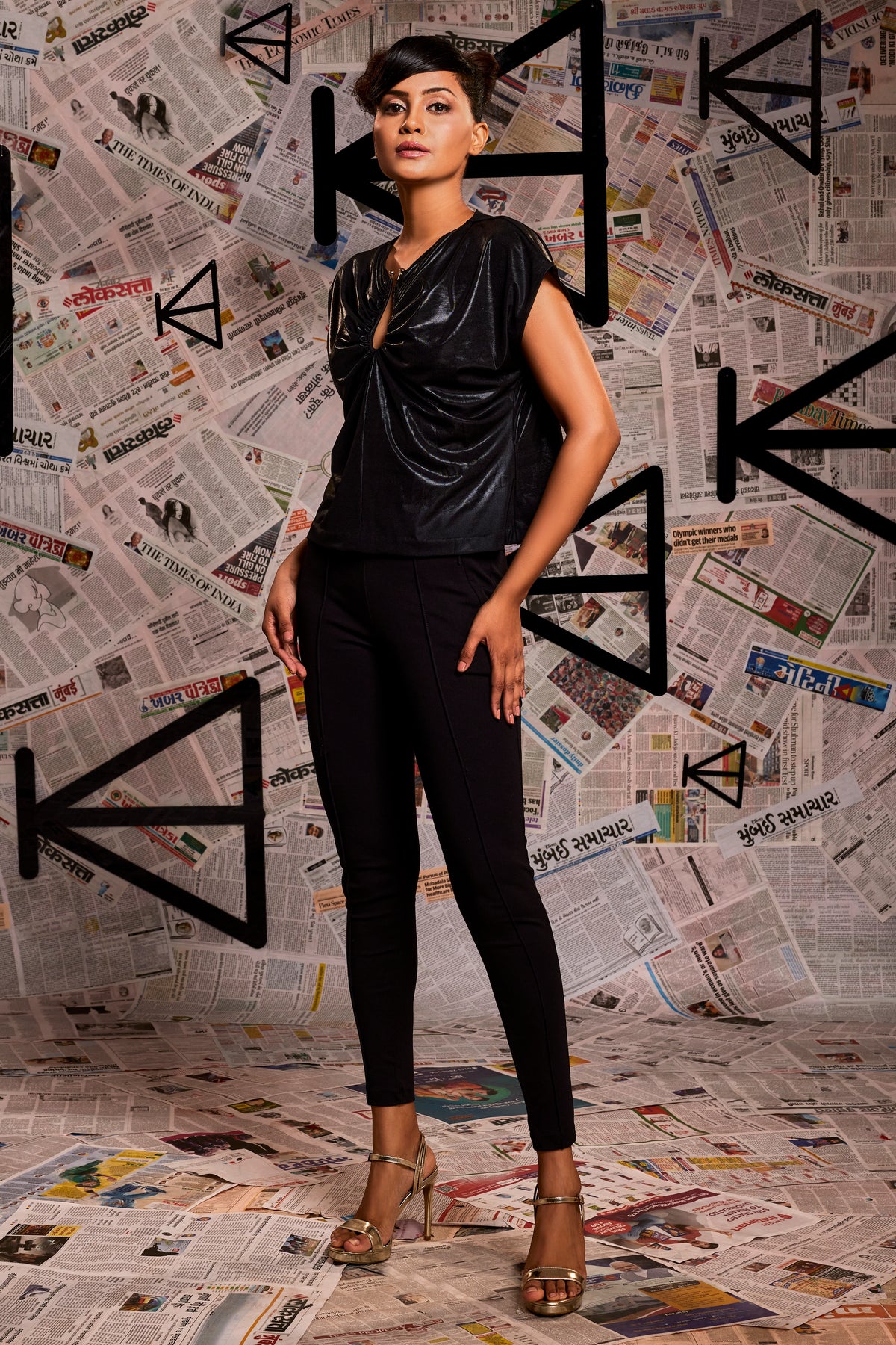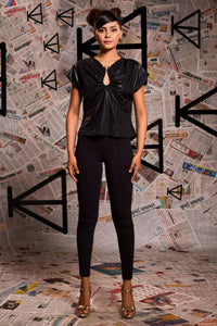Black lamme loop top with ruching.
