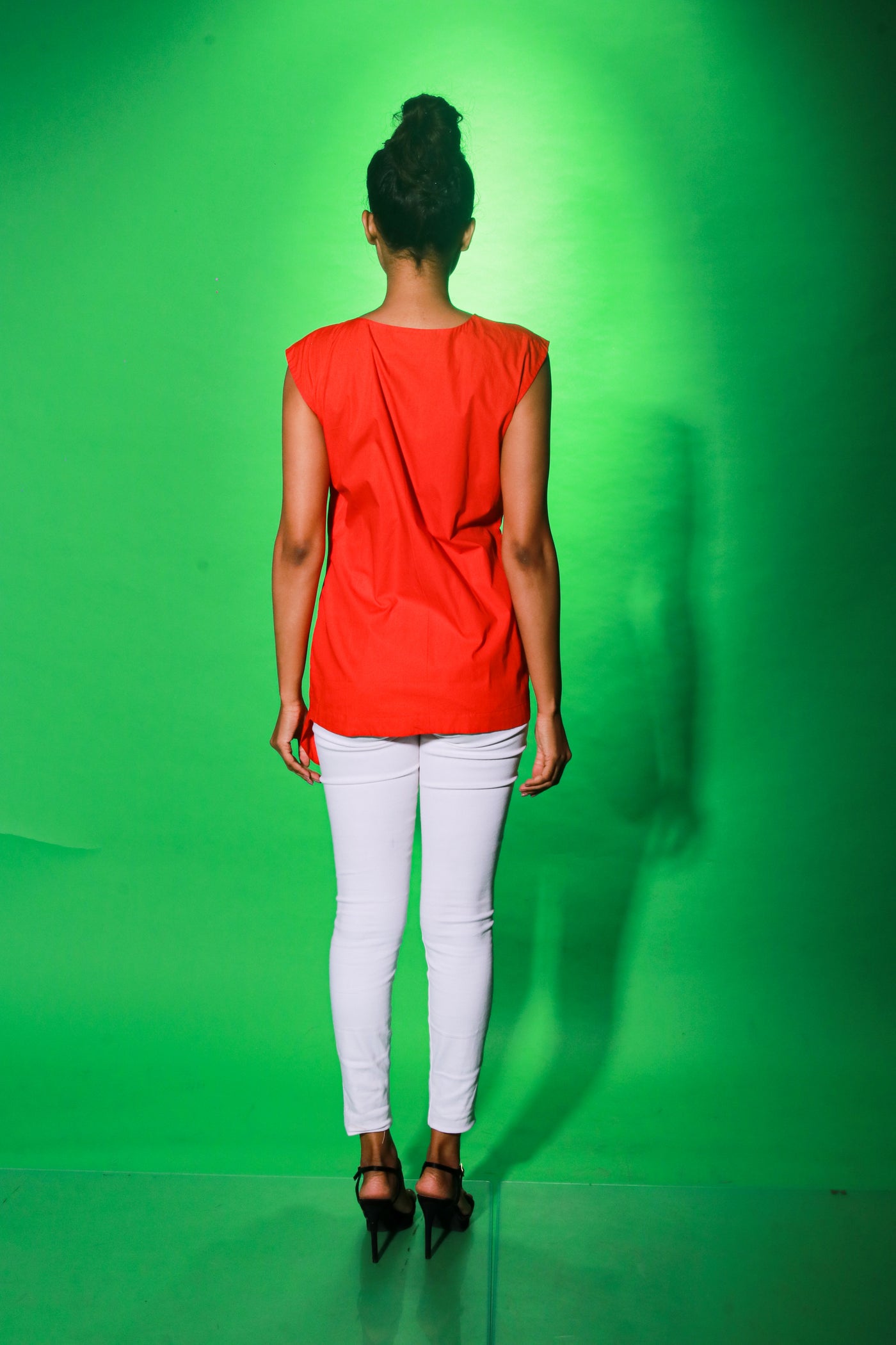 Coral sleeveless top features an off center zipper placket and frill detailing.