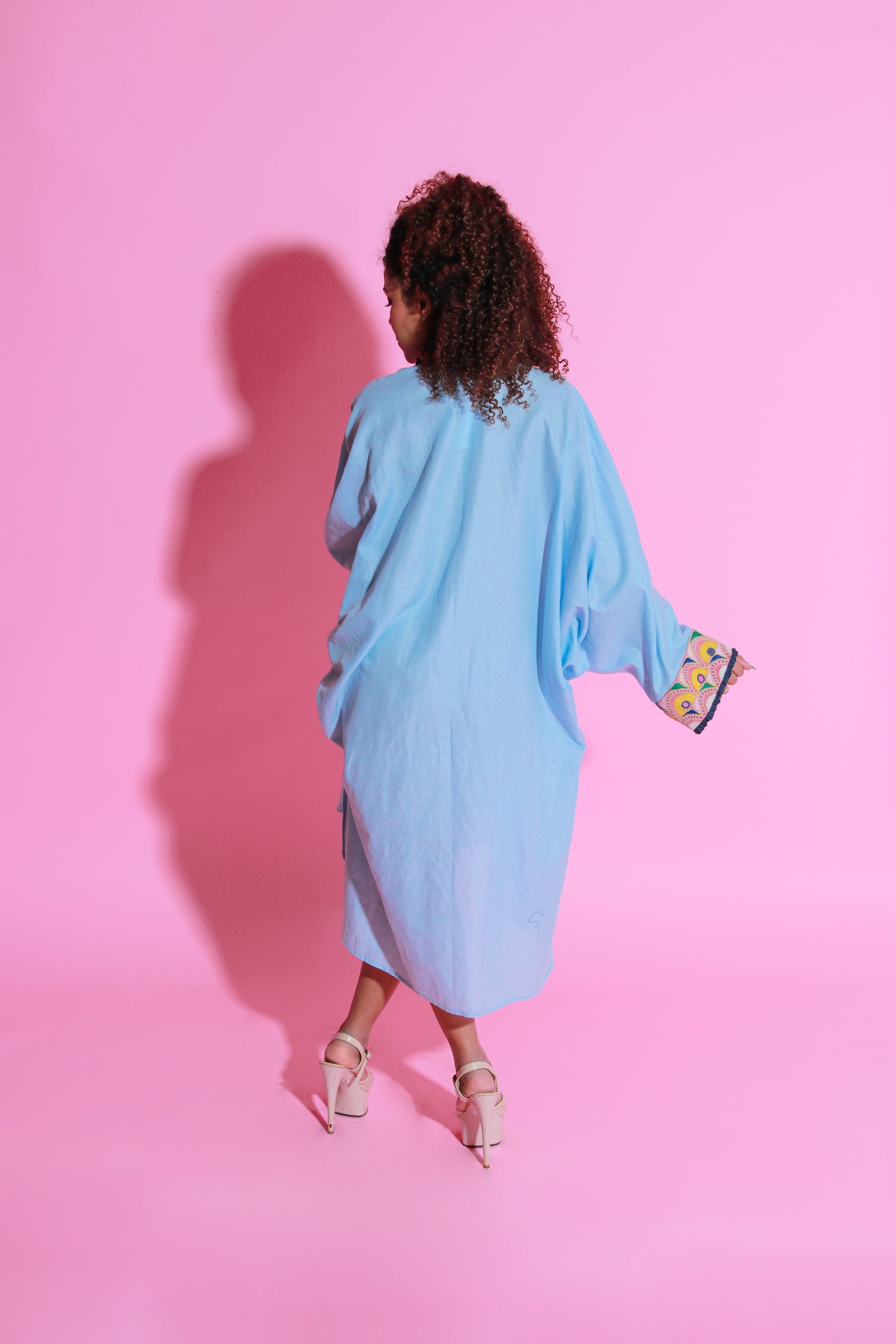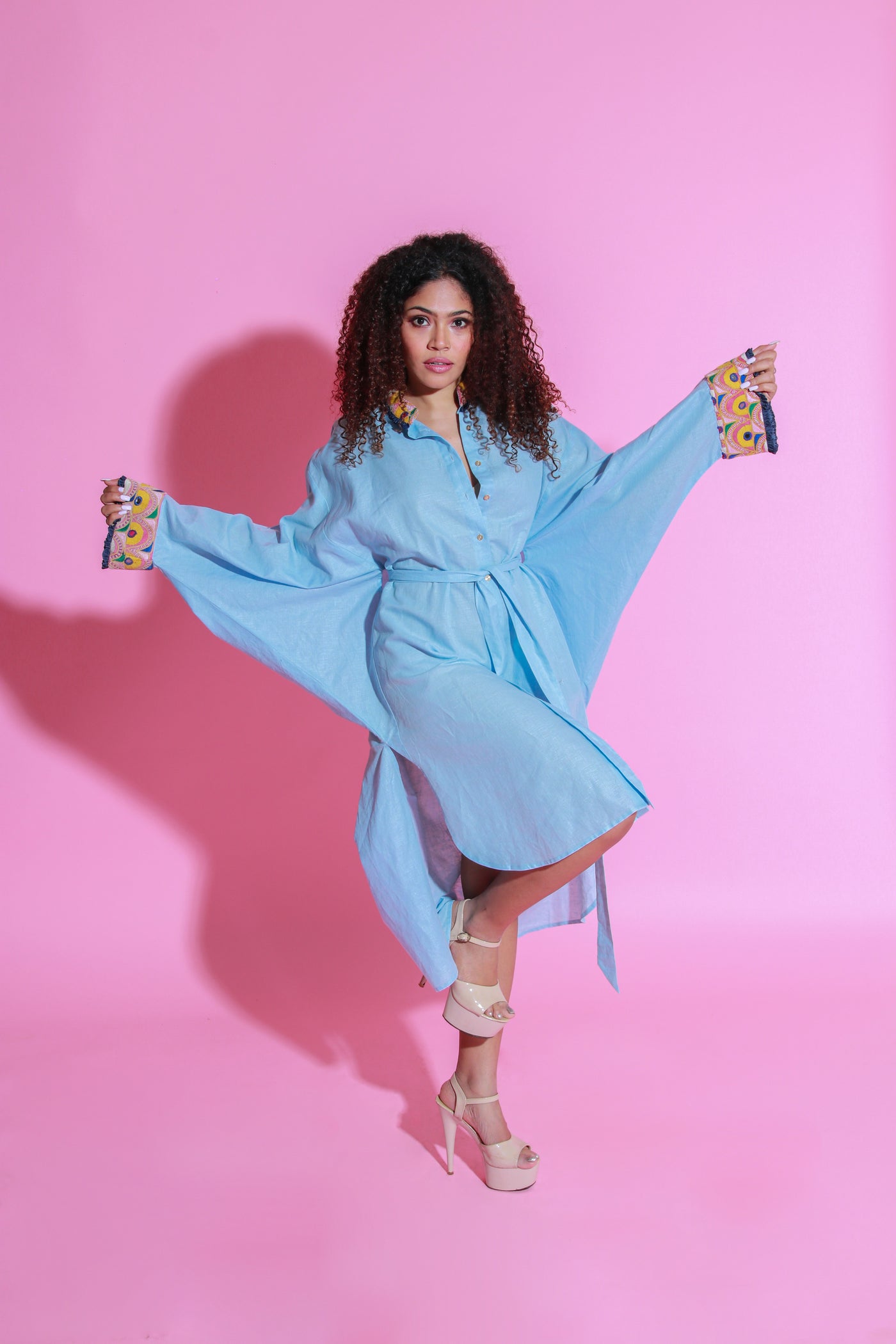 Sky blue dress crafted in pure linen, half belt feature and Kutch embroidery with apple hemline.