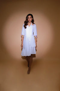 White shirt dress features a pleated yoke with Kutch border on collar and cuffs.