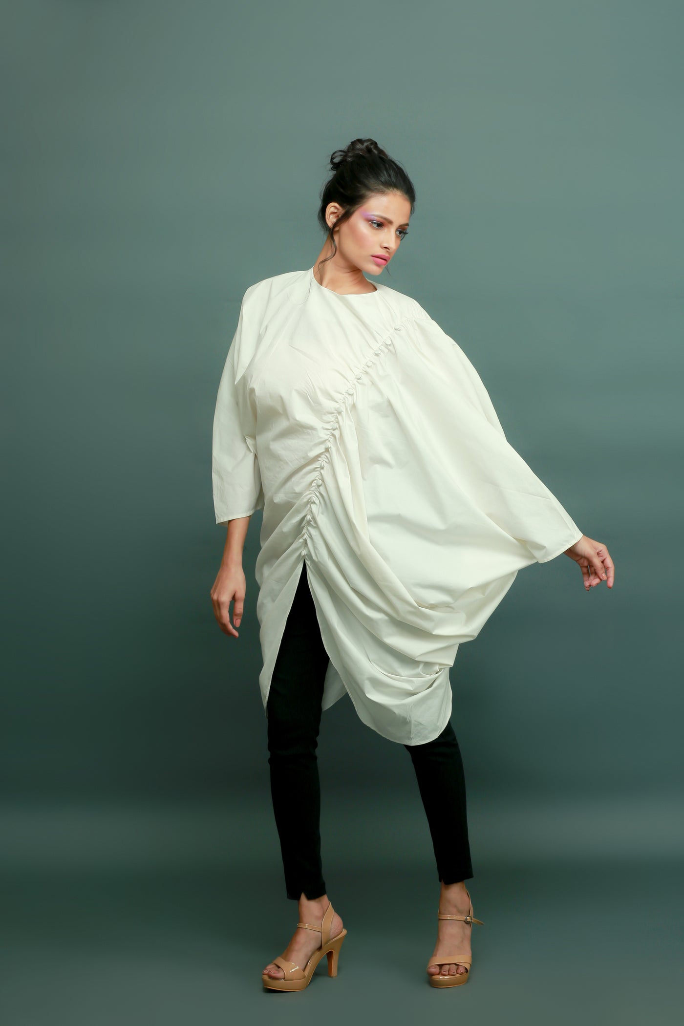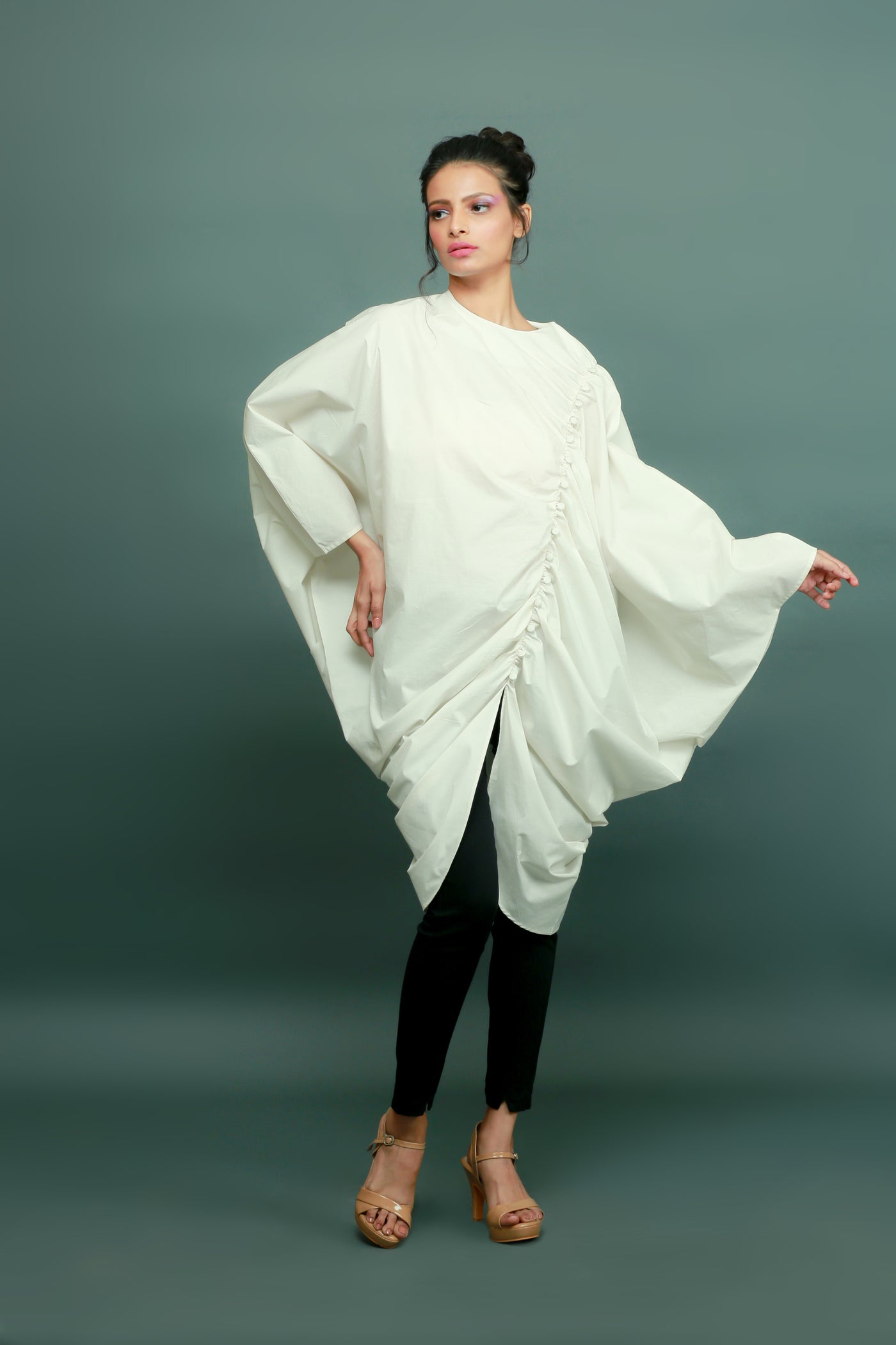 Off-white raglan sleeves top with gathers and a self-button feature on the left side.