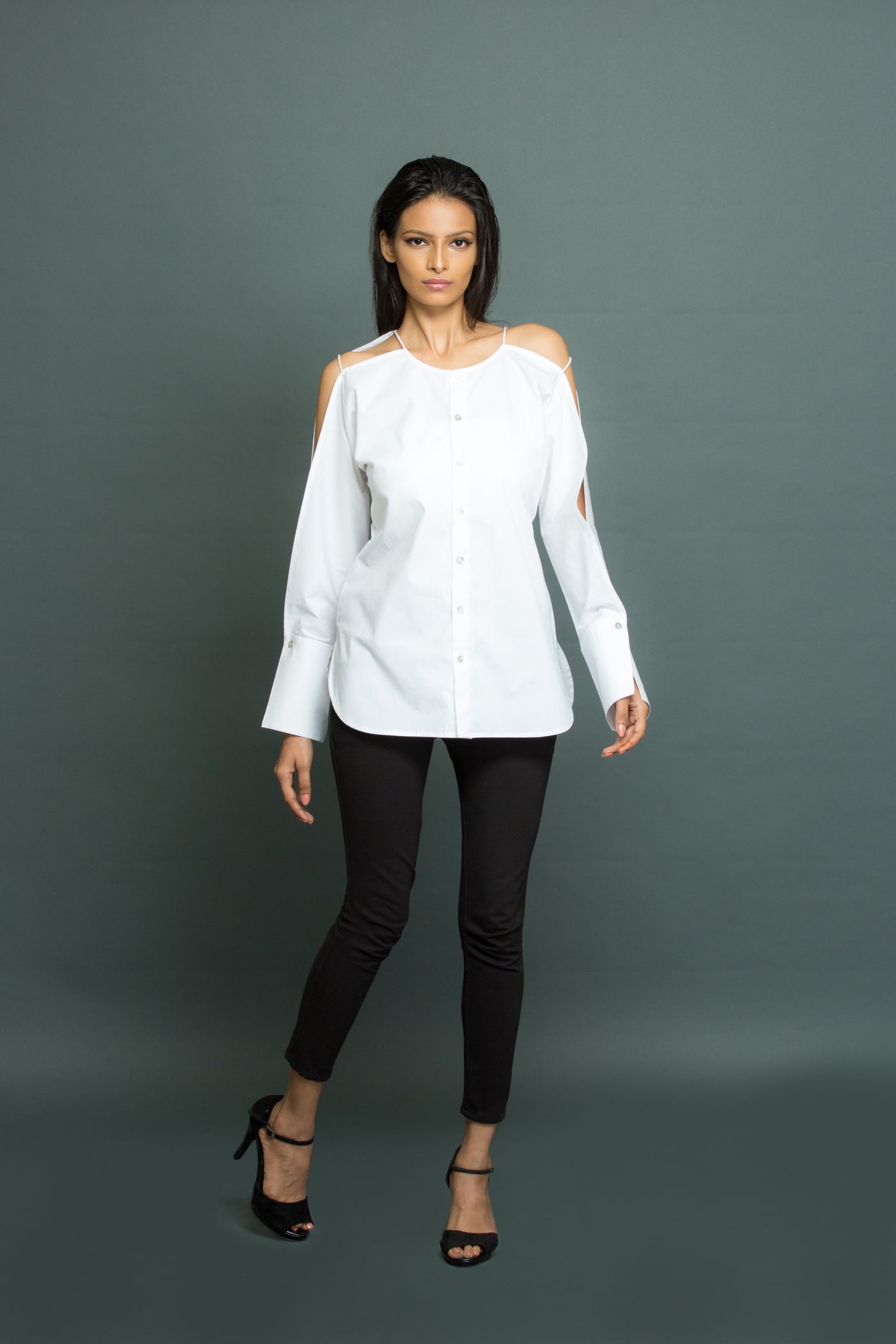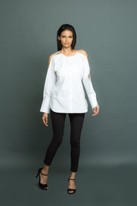 White top with open sleeve feature with self strings